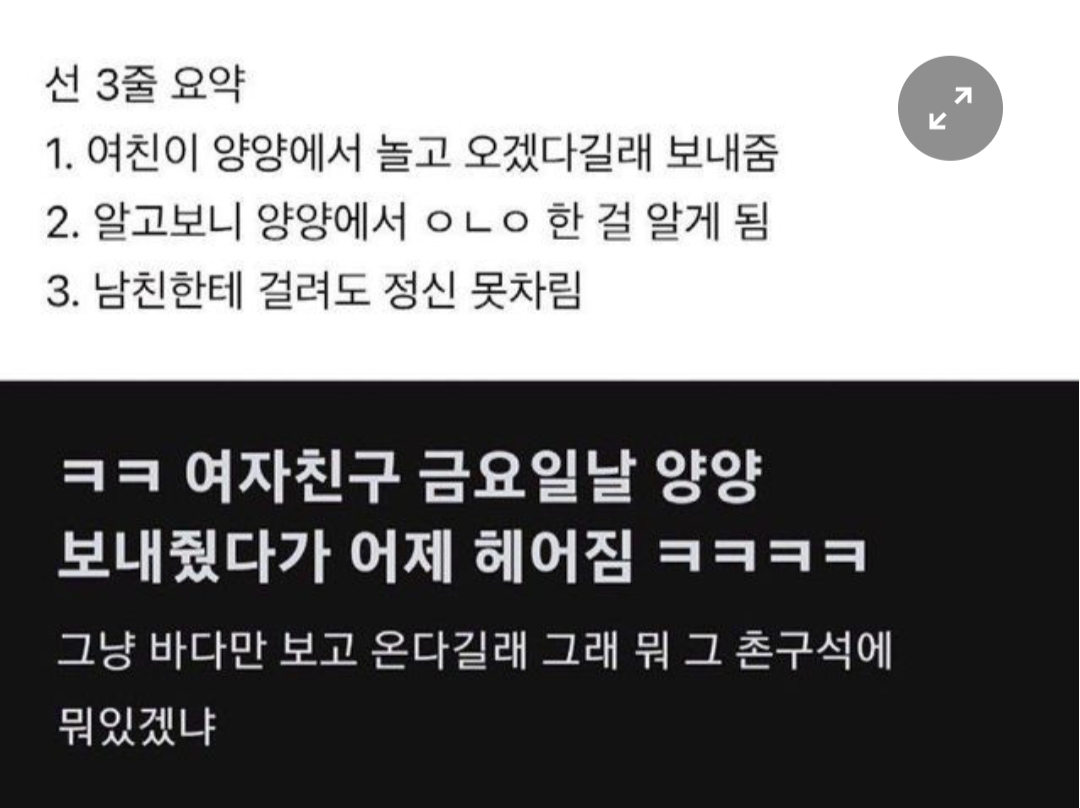 양양 가면 다 이러나?? 이전에는 야설 작가 데뷔를 봤는데 이번에는 찐 후기 같이 여친 양양 보냈더니 정신못차리는 썰... 진짜 양양은 무서운 곳이구나 ㅋㅋ
