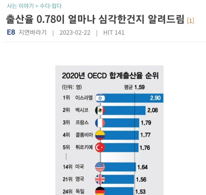 출산율이 0.78인 현재 전세계적 순위를 찾아보았습니다.