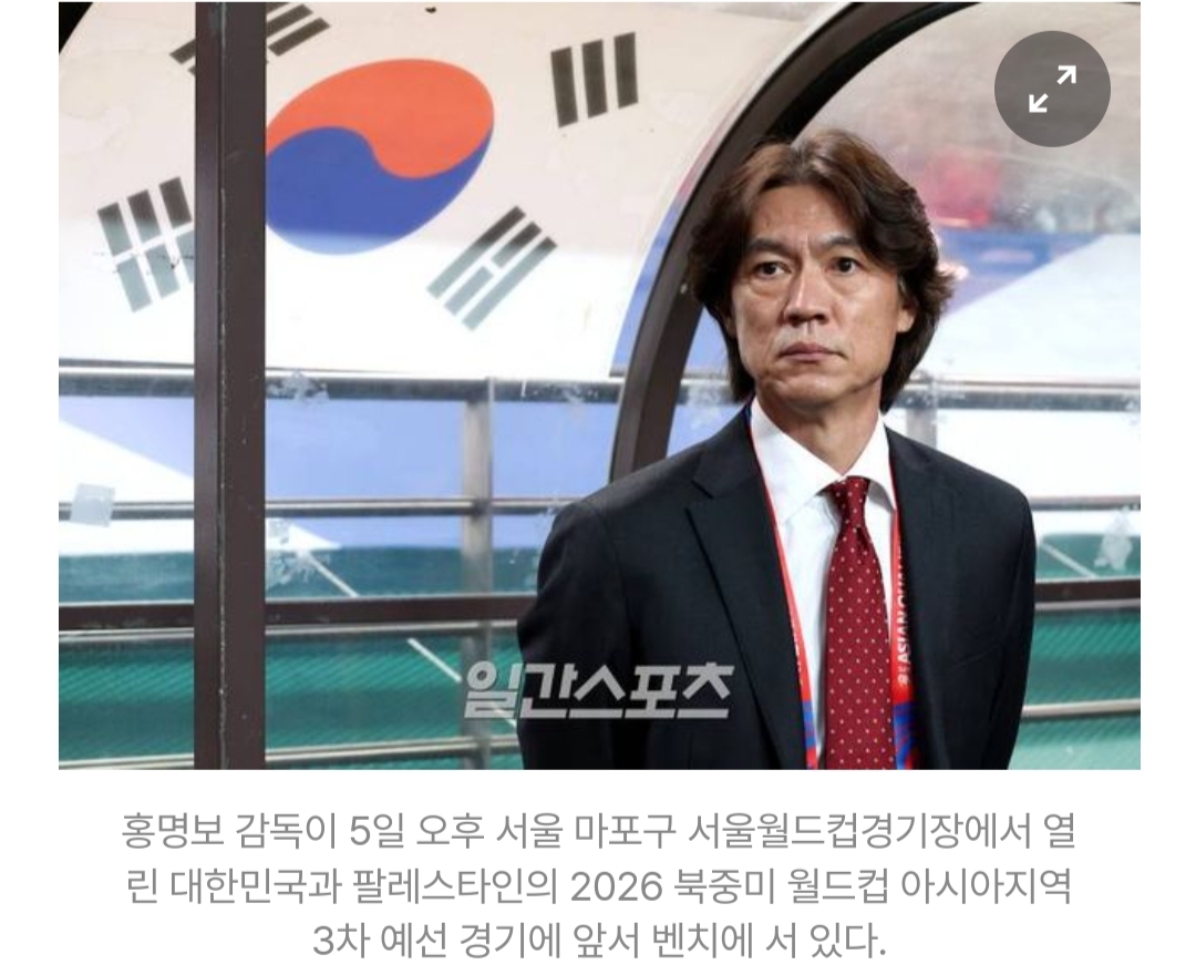 홍명보 감독이 5일 오후 서울 마포구 서울월드컵경기장에서 열린 대한민국과 팔레스타인의 2026 북중미 월드컵 아시아지역 3차 예선 경기에 앞서 벤치에 서 있다. 상암=김민규 기자